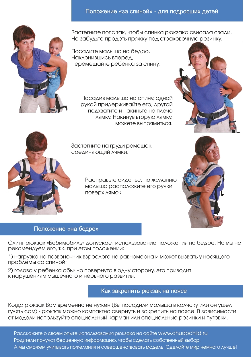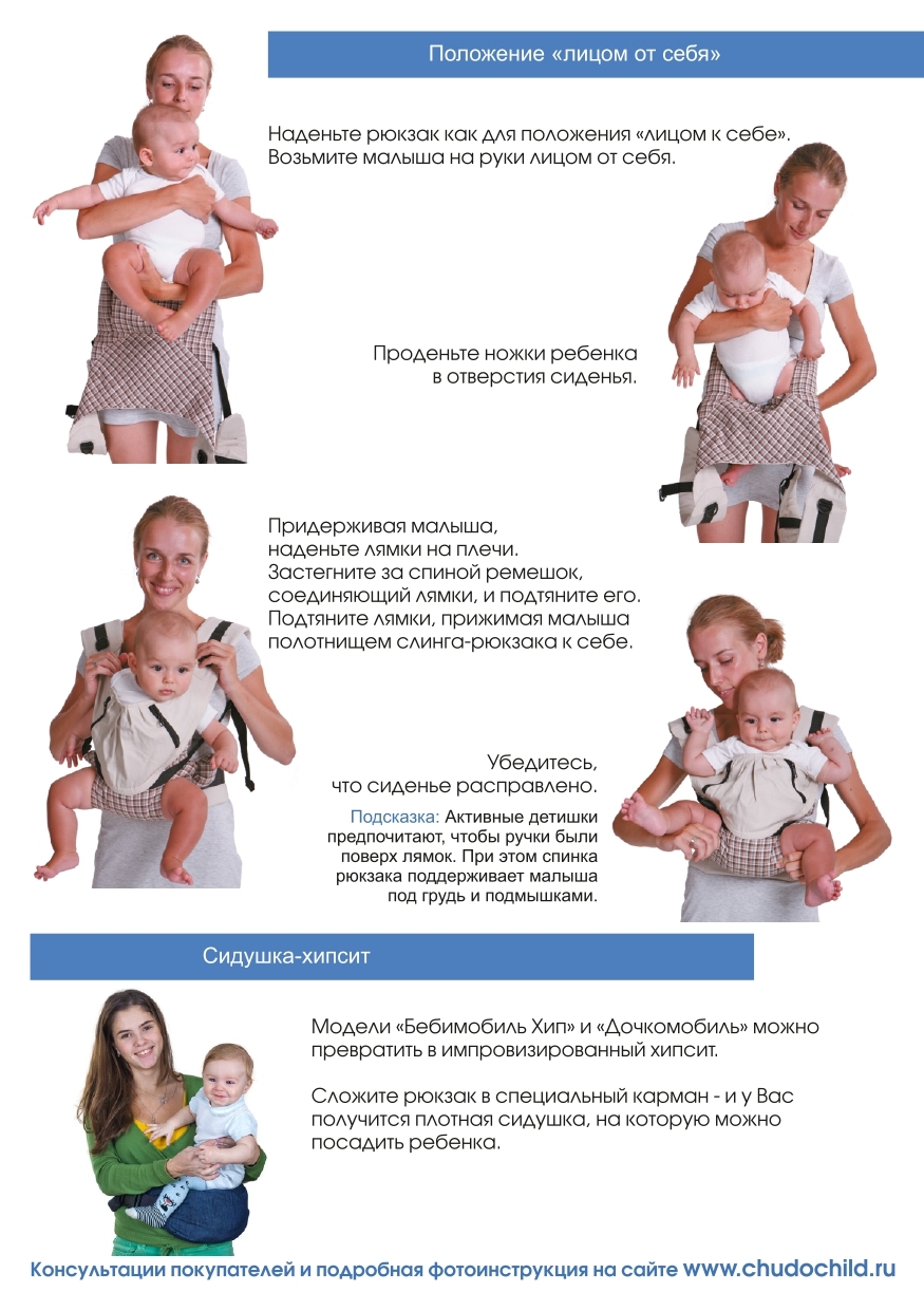 Носим как удобней «Бебимобиль Хип» обеспечивает анатомически правильную посадку ребенка (он плотно прижат к маме, а ножки широко разведены в стороны и как бы обхватывают маму). В то же время модель позволяет носить малыша лицом вперед и за спиной – возможности, обычно доступные только в кенгурушках. Более того, ее можно использовать как хипсит. Иными словами, в рамках одной модели родители получают возможность выбирать любой удобный вариант ношения. Покупать отдельно кенгурушку, слинг-рюкзак и хипсит не придется. Такие возможности «Бебимобиль Хип» – результат долгой и тщательной работы специалистов «Чудо-Чадо»™. Каждое улучшение в обязательном порядке тестировалось родителями, и было ими полностью одобрено.