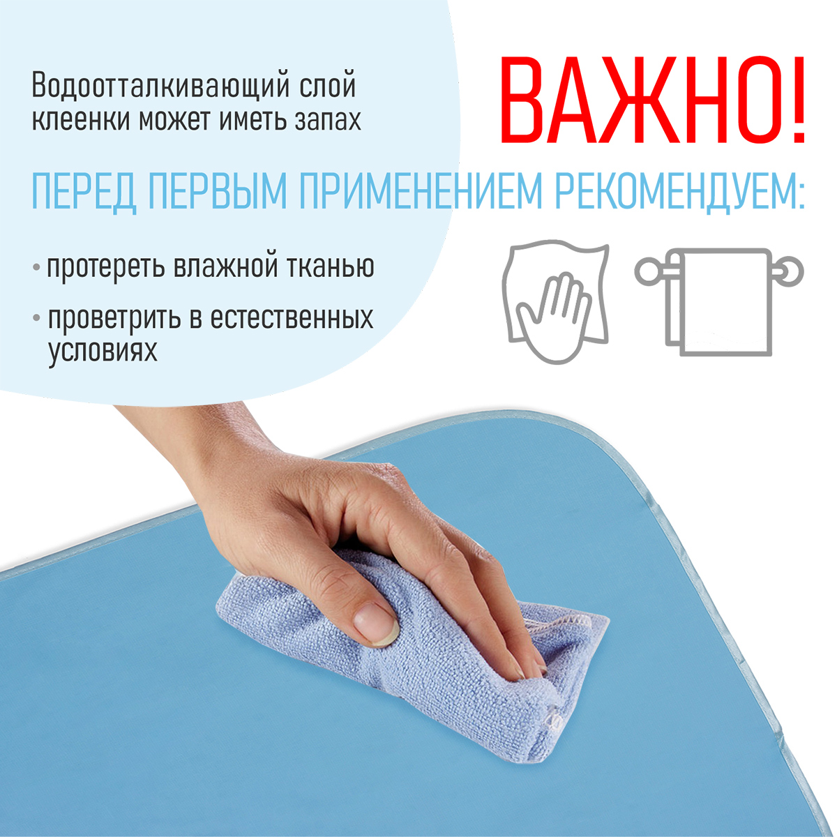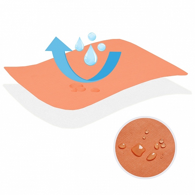 Перед первым применением или при загрязнении достаточно протереть ее влажной тканью, с использованием мыльного раствора или 1% раствора хлорамина, затем высушить. Пожалуйста, не используйте абразивные моющие средства, во избежание отслоения непромокаемого слоя.