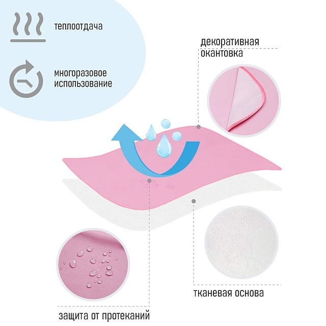 Перед первым применением или при загрязнении достаточно протереть ее влажной тканью, с использованием мыльного раствора или 1% раствора хлорамина, затем высушить. Пожалуйста, не используйте абразивные моющие средства, во избежание отслоения непромокаемого слоя.