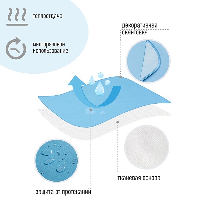 Перед первым применением или при загрязнении достаточно протереть ее влажной тканью, с использованием мыльного раствора или 1% раствора хлорамина, затем высушить. Пожалуйста, не используйте абразивные моющие средства, во избежание отслоения непромокаемого слоя.